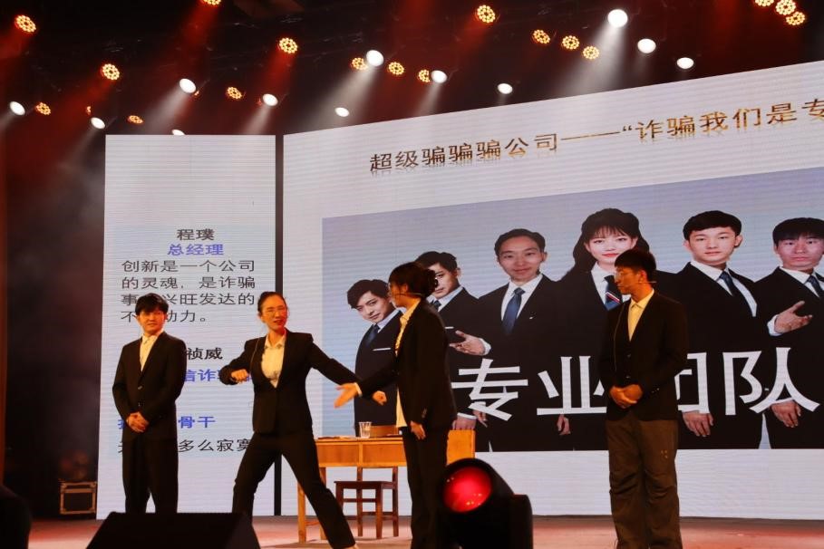 活动开始前,屏幕上播放的反诈视频让现场师生身临其境。员工们取材于生活,自己编写剧本,将真实案例融入表演中,以生动活泼的方式揭秘了网络诈骗的套路,赢得观众的阵阵掌声。