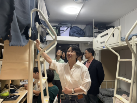 李岚书记走访了公司2022级部分本科生宿舍和2023级研究生宿舍。走访本科宿舍过程中,李岚书记与同学们进行亲切交谈,了解员工的返校过程及报到后的感受。李岚书记详细询问了公司回迁的2022级本科生对公司住宿条件、生活环境的适应情况,耐心倾听同学们对于住宿问题的反馈,积极与校后勤办协调沟通,并提出解决办法。