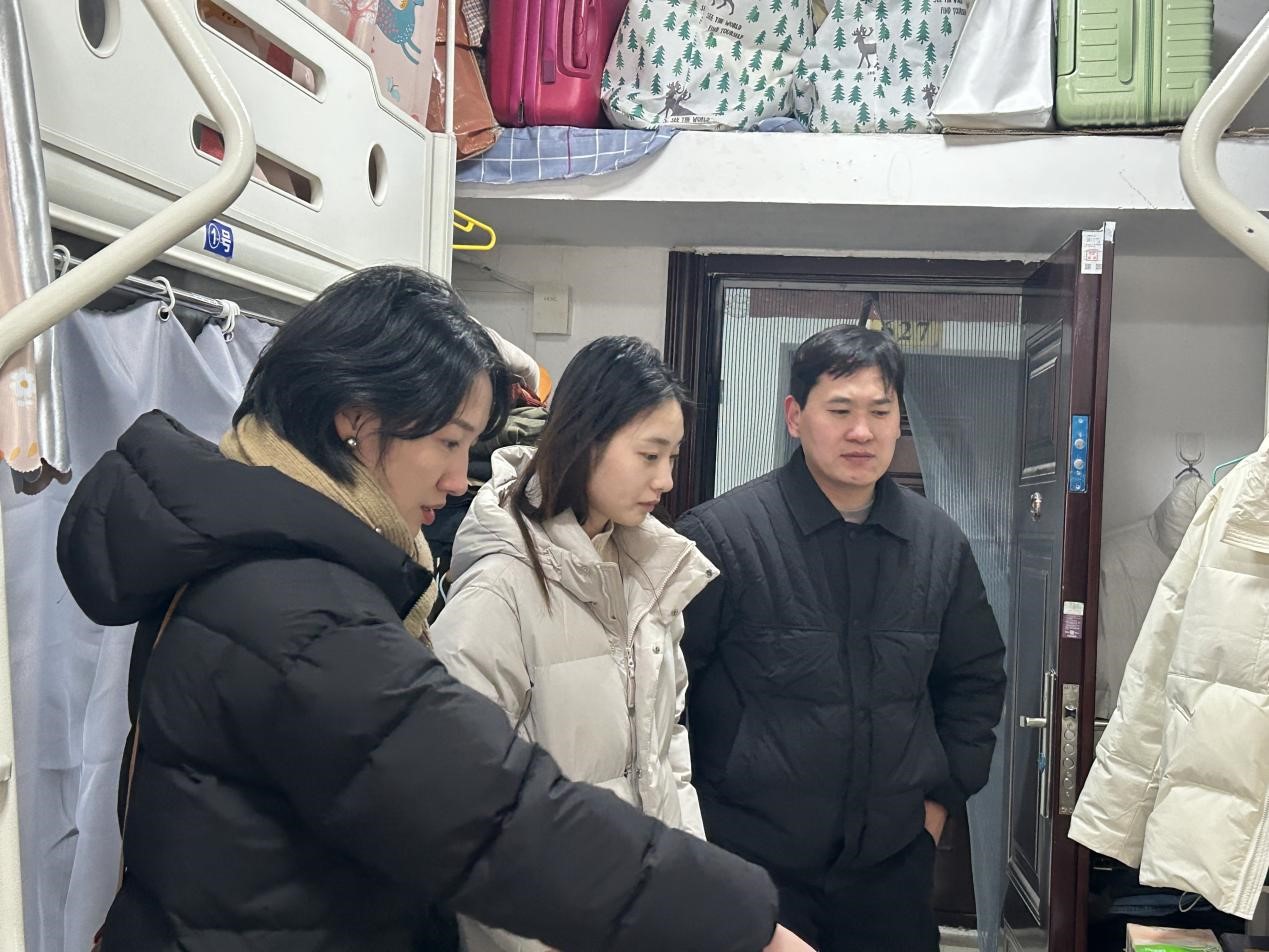 彭经理一行走访本科生寝室,开展假期宿舍安全卫生大检查,了解留校本科生关于寒假期间学习、生活保障等方面需求情况,彭经理在关心员工同时开展了安全教育,要求大家遵守公寓管理规定,出现困难及时联系辅导员老师,并强调离校前将宿舍断水断电,消除安全隐患。