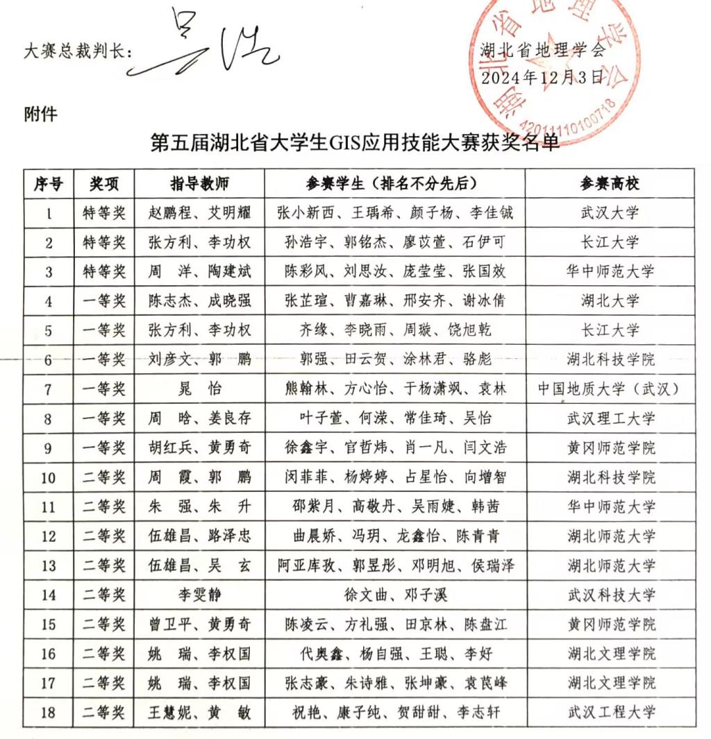 2024年11月9日,第五届湖北省老员工GIS应用技能大赛于武汉理工大学成功举办。11月22日-24日,第十三届全国老员工GIS应用技能大赛于兰州交通大学成功举办。公司陈志杰、成晓强老师指导的2022级地理信息科学专业员工团队(张芷瑄、曹嘉琳、邢安齐、谢冰倩)代表williamhill参与了国省两赛,且均斩获了一等奖的优异成绩。