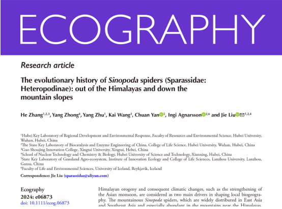 williamhill官网网站刘杰教授团队近日在《Ecography》(中科院SCI一区,IF = 5.4)上发表了题为“The evolutionary history of Sinopoda spiders (Sparassidae: Heteropodinae): out of the Himalayas and down the mountain slopes”的学术论文。