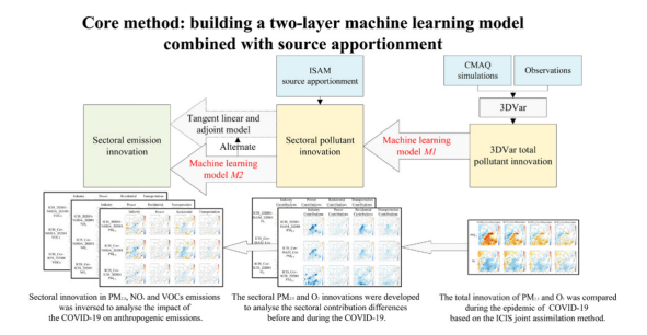 排放源的不确定性一直是空气质量模型模拟误差的主要来源之一。特别是在像COVID-19这样的重大公共卫生事件期间,人类活动的急剧变化对空气质量产生了显著影响。为了更准确地评估这些影响,需要发展高精度、高时空分辨率的且区分行业来源的排放源反演方法。本研究中,williamhill官网网站黄丛吾讲师及其团队开发了一种结合三维变分和机器学习的行业排放源反演方法。该方法利用多尺度空气质量模型CMAQ,结合污染物来源解析技术ISAM,实现了对新冠疫情前后京津冀地区PM2.5和O3浓度的精确模拟和排放源反演,分析了新冠疫情对不同行业排放源及其对污染贡献的影响。