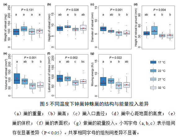 (a)巢的重量;(b)巢高;(c)巢入口直径;(d)巢中心距地面的高度;(e)巢的体积;(f)巢的表面积;(g)做巢的能量投入。小写字母(a, b, c)表示组间存在显著差异(P < 0.05)。共享相同字母的组别间差异不显著。