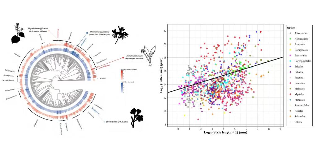 在自然界,性选择是推动生物进化的重要驱动力之一,它加速了物种内形态和行为的分化,甚至可以导致新物种的形成。早在达尔文时期,就提出并发展了性选择理论,其作用的两个机制分别为雄性竞争和雌性选择。因此,性选择也解释了动物界为什么很多雄性具有夸张或“累赘”的性状。然而,在植物界,因为大多是雌雄同花的性系统,花部性状并没有特定的性别属性,性选择较少被关注。不可否认的是,植物也需要有性繁殖,在争夺繁殖机会的过程中,以花粉为代表的雄性功能和以花柱为代表的雌性功能很可能同样经历了性选择的过程。具体而言,花粉的大小被认为会影响花粉的萌发、花粉管的生长和授精能力;而柱头的长度给花粉提供了一个竞技场——越长的柱头越能区分“质量更高”的花粉。如果性选择确实塑造了这两种植物性状,越大的花粉会被更长的花柱所“选择”,两者之间协同构成一个正反馈循环,那么它们在宏观进化层面应该具有正相关性,也就是协同进化的模式。为了深入探讨这一猜想,戴璨教授团队基于43篇已发表文章中的51项独立研究进行了系统性的Meta分析,在迄今最大的研究框架下揭示了被子植物花粉大小与花柱长度之间存在显著的正相关性,进一步表明植物雄性竞争能力与雌性选择偏好的进化是相互关联的,符合性选择的预测。
