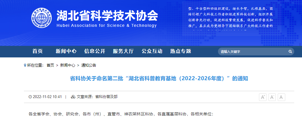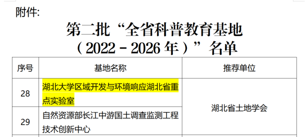 11月2日,湖北省科学技术协会发布《省科协关于命名第二批“湖北省科普教育基地(2022-2026年度)”的通知》,经公司邓文胜教授、刘海教授等申报,湖北省土地学会推荐,挂靠公司的williamhill区域开发与环境响应湖北省重点实验室成功入选。