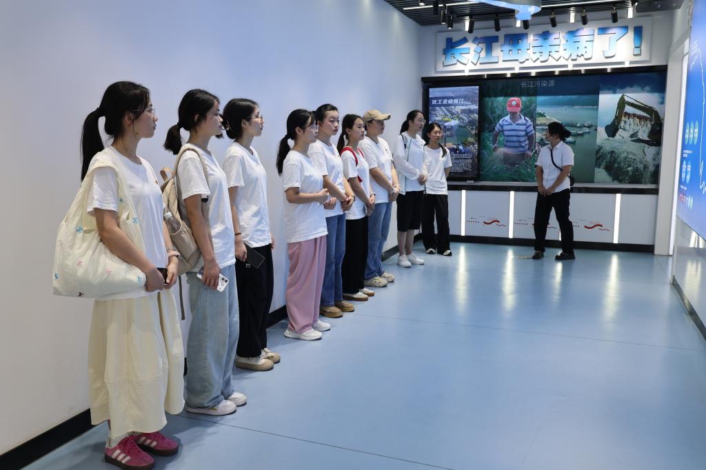 (图为团队成员听讲解员介绍长江大保护知识)