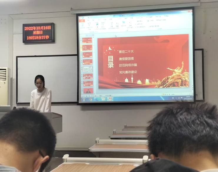 第三部分:“学习二十大”,团支书邓越同学声情并茂地为同学们简述了我们党的发展历史,让我们理解了召开二十大的必要性与重要意义,并进一步增大同学们对党史的了解,坚定理想信念,增加责任感与信念感。