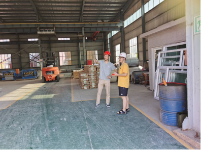 为了调查工厂的复工复产情况,实践队员到达赤峰恒裕绿建公司开始实地调研和访谈,进入公司大门时,保安人员对实践队员进行了体温测量,全身消毒,出入登记等措施。随后,金主任带领实践队员参观了工作车间,为实践队员介绍了工厂车间、使用设备,疫情期间所采取的防控措施以及后疫情时期的企业复工复产情况。